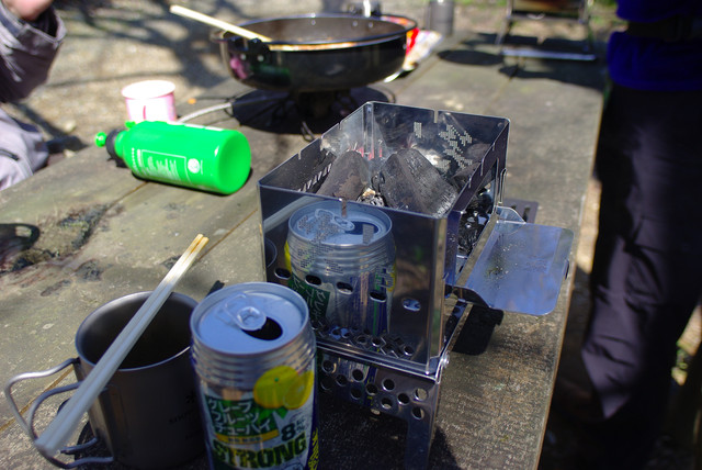 最初はストレートで飲んでたけど、日が落ちて寒くなってきたから、